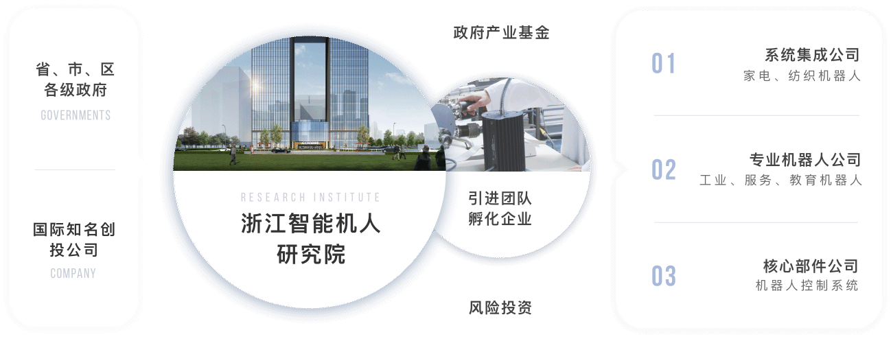 研究院依托浙江大學機器人研究中心和浙江省機器人産業發展協會合作的同時,吸收金沙江聯合資本、之江實驗室等多方位資源,并與聯盟成員單位及國内外其他機器人研究機構、知名機器人企業形成互補合作關系并取得多項成果,積極打造一個智能機器人産業技術平台。
